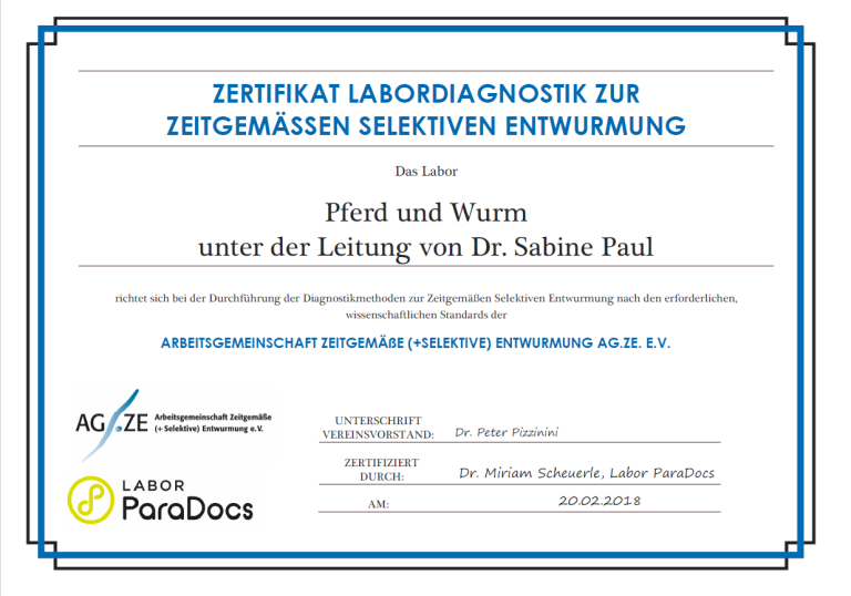 Pferd und Wurm ist ein AG.ZE zertifiziertes Labor zur Durchführung von Kotuntersuchungen im Rahmen der Zeitgemäßen (+Selektiven) Entwurmung beim Pferd (ZSE).
